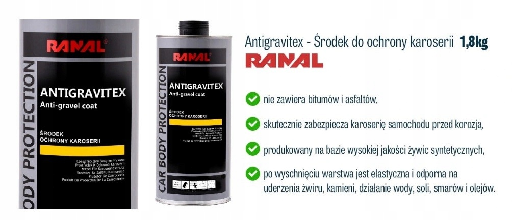 ANTIGRAVITEX to popularny środek do ochrony karoserii, który powstał w wyniku zastosowania w produkcji odpowiednio wyselekcjonowanych żywic syntetycznych. Ich wysoka jakość oraz brak zawartości bitumów czy asfaltów sprawia, że jest to produkt niezwykle skuteczny, który pozwoli na doskonałe zabezpieczenie karoserii samochodu.